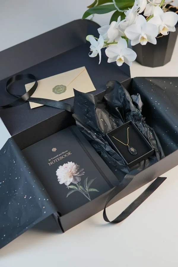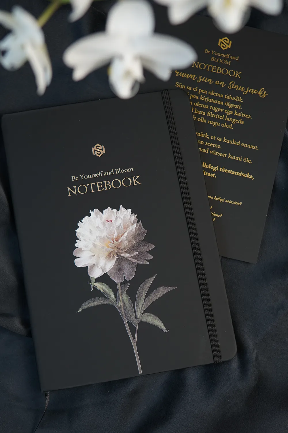 A refined A5-size notebook with a soft-touch black cover and delicate floral design.