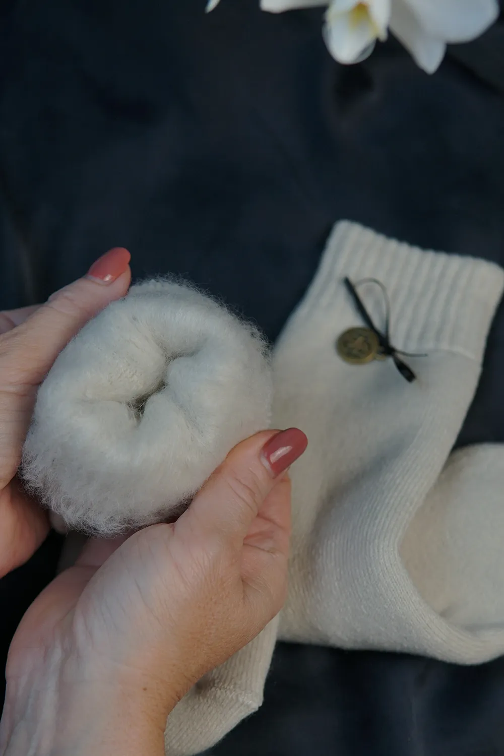 Kašmiiri / villa / akrüüli segu. Seest karvastatud ja eriti pehmed. Värv valitakse juhuslikult - valikus pastelsed toonid ja must.